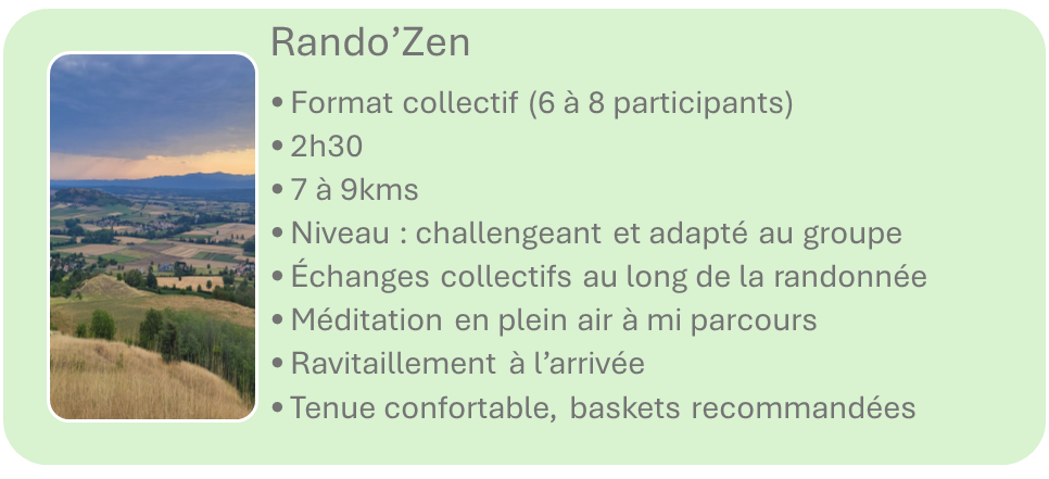 Au départ de Vertai’Zen, vous vous embarquez pour une marche active partagée avec 8 participants maximum, pendant 2h à 2h30 dans les chemins et au sommet des collines alentours.